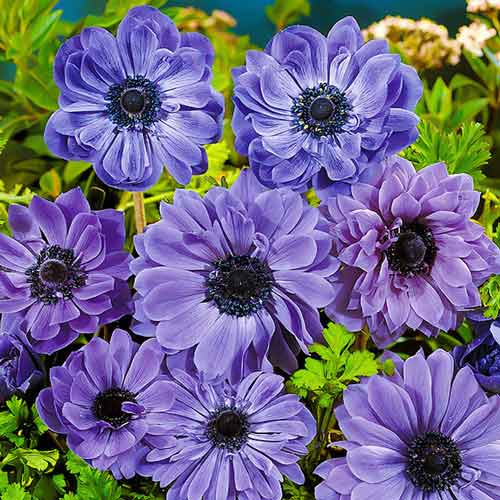 Луковицы анемоны махровой Лорд Лейтенант (Lord Lieutenant) – эффектный цветок с необычными сине-фиолетовыми лепестками на фоне изумрудной листвы. Прямые стебли держат очаровательные густые соцветия. Второе название – ветреница. При густой посадке цветущее растение напоминает синее облако. Длительность цветения до 2-х недель.