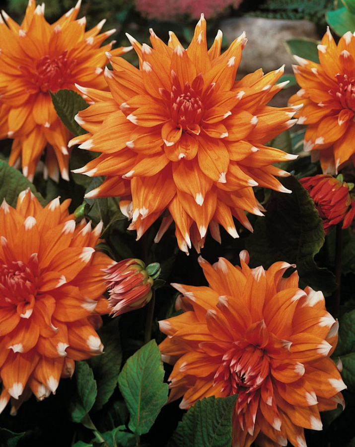 Луковицы георгины Color Spectable предпочитают расти на легких питательных почвах. Месторасположение — полное солнце. Это компактный сорт, который достигает в высоту до 90 см, а в ширину — до 45-60 см. Цветки очень красочные, махровые, насыщенного оранжево-красного цвета с белыми кончиками. Соцветие-корзинка в диаметре достигает до 25 см. Период цветения длится с июня — июля до наступления осенних заморозков. Георгины Color Spectable прекрасно смотрятся в одиночных посадках и вместе с другими многолетниками. На зиму клубни рекомендуют выкапывать и помещать в прохладное сухое место.
