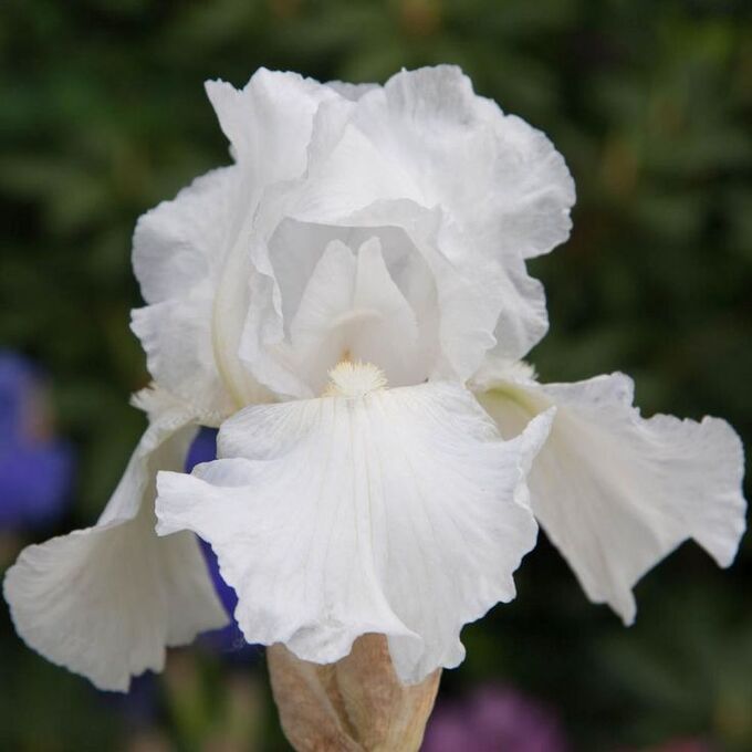 Ирис Глоуинг Серафин цветет в июне. На его цветоносах появляются белые бутоны, которые вскоре раскрываются в легкие гофрированные цветы. Лепестки однотонные, только возле их основания находится ярко-желтая кайма. Благодаря высокому и прочному стеблю, а также способности сорта долго храниться после среза он подходит в том числе для создания букетов.