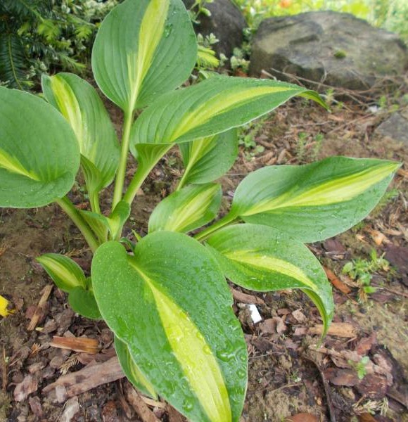 - Привлекательный сорт хосты, листья в форме сердца, в основном зеленые, с тонкой желтой полоской в середине листа, ближе к осени меняют цвет становятся средне-зелеными с кремовой сер