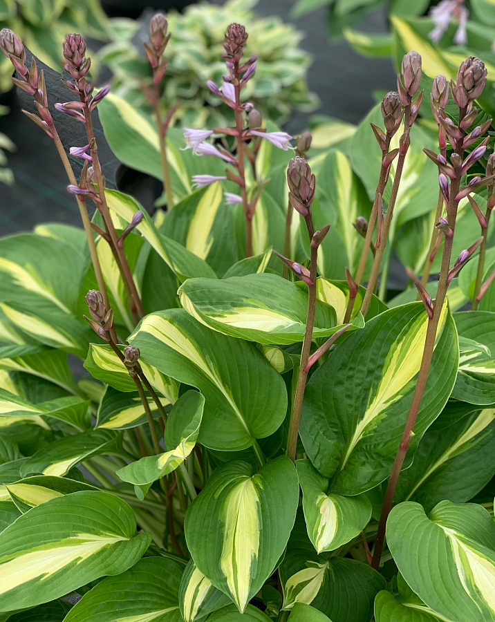 Саженец хосты гибридной Брод Стрит (Broad Street) Такое растение само по себе смотрится ярко и оригинально, выделяется как в одиночных посадках, так и в групповых посадках на газонах, оформления цветников, украшения бордюров, около водоемов. Прекрасный сорт, отличающийся рядом особенностей: