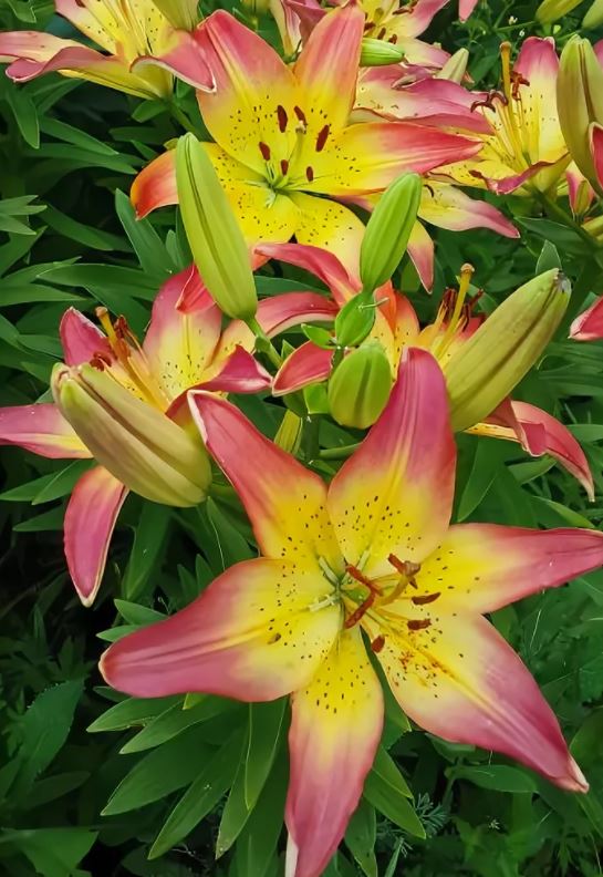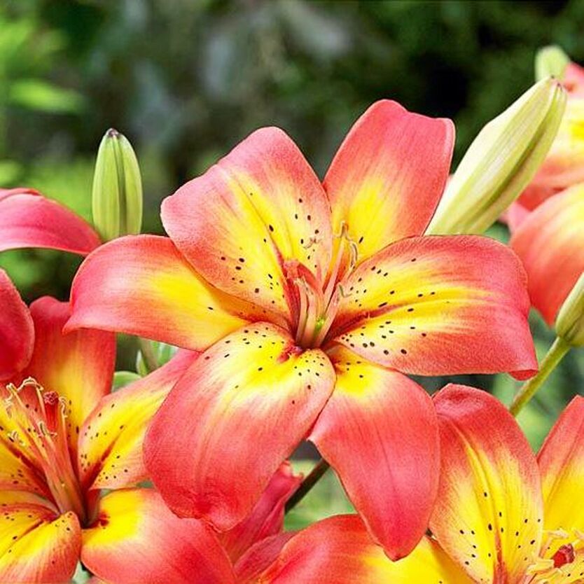 Луковицы азиатской лилии Коста-дель-Соль (Lilium asiatic Costa Del Sol) привлекают внимание буйством красок. Растение низкорослое. Прочные темно-зеленые стебли вырастают до 0,6 м в высоту. Окраска двухцветная – от центра к середине лепестка желтая, а кончики красно-розовые. У горла редкий, мелкий темный крап. Размер цветка около 13 см. Распускается в июне и июле. Лилии хорошо развиваются на солнечных, защищенных от сквозняков местах и в полутени. Предпочитают рыхлые, дренированные почвы. Не любят переувлажнения, плотных грунтов. Сорт используется на срезку, для украшения клумб. Хорошо смотрится в кашпо.