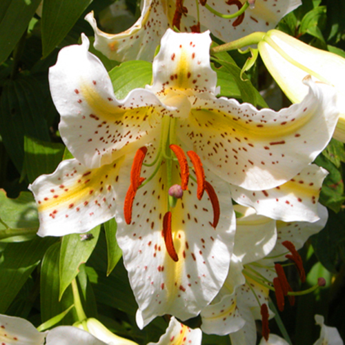 Окраска цветка : крупный, белый, вдоль лепестков широкая ярко-желтая полоса, ярко-оранжевые пыльники и крап по большей поверхности лепестков