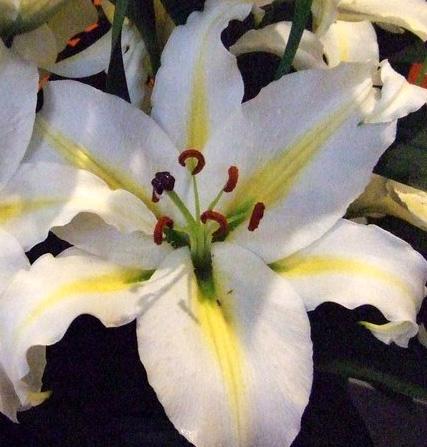 Саженцы и рассада лилии восточной Легенда (Lilium) наполнят сад благоуханием больших ароматных цветков. Высота растения 100-110 см. Цветки белого цвета с ярко-желтой полосой по середине каждого лепестка, которая становится зеленой ближе к центру. На этом фоне контрастно смотрятся оранжево-коричневые пыльники тычинок.