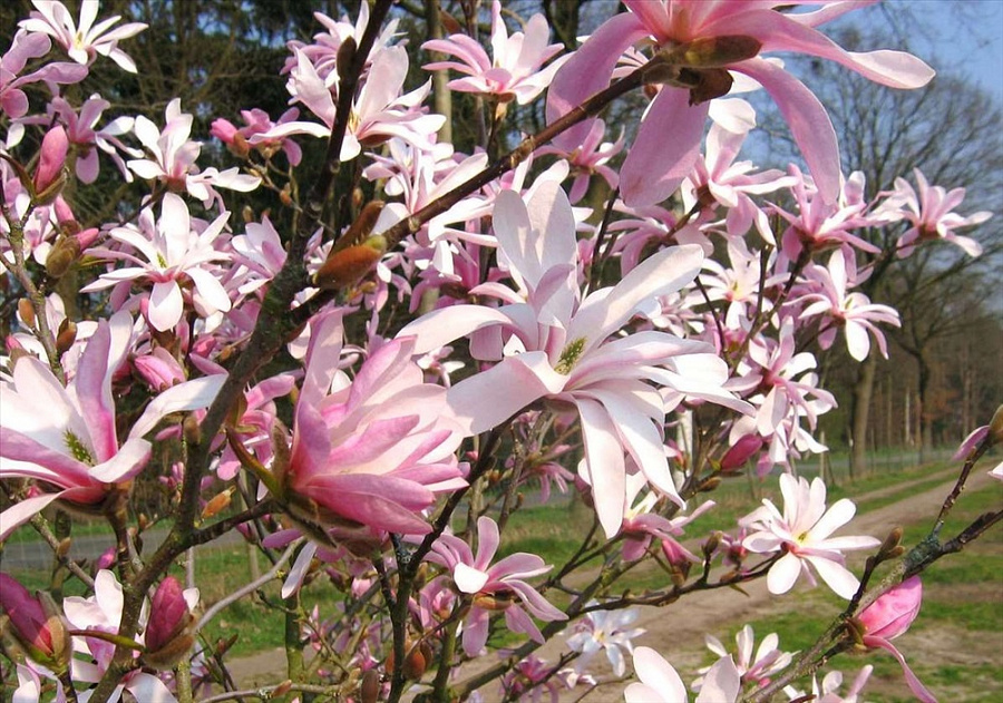 Саженцы магнолии Лебнера Леонард Мессел (Leonard Messel) вырастают в живописный многоствольный кустарник, усеянный бело-розовыми цветами. Вырастает крупномер до 5-6 м в высоту, может разрастаться в ширину и размножаться черенками. Магнолия Лебнера Леонард Мессел – гибридный сорт средней морозостойкости. Цветы имеют форму звезд, цвет их варьируется от белого внутри чаши до темно-розовых лепестков. Цветение: апрель - май. Преимущества: